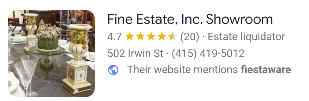 As I’ve covered in-depth here in my column, justifications are a big deal and you can influence them. If the query you’re investigating is triggering justifications on either your listing or your competitors, write down the exact language and source. Justifications come in many flavors, including website, review, sold here, services, menu, in-stock and posts. In the above example, in a local search for “fiestaware”, Google’s display of a website-based justification is a strong signal to us of just how highly they associate this entity with our search term. Mark a “win” for the competitor if they are earning a justification, and you are not.