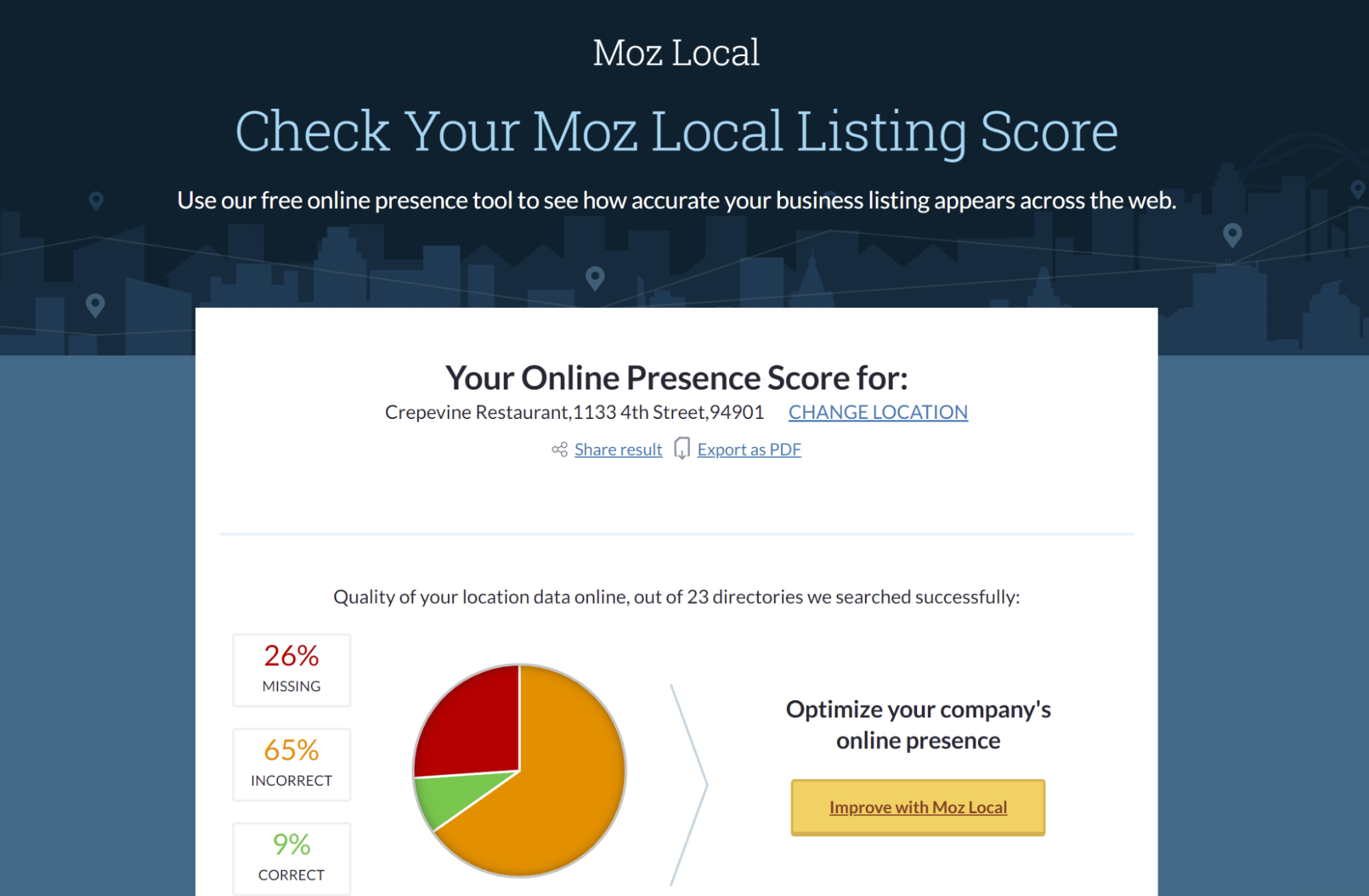 Now, evaluate the health of citations across the local search ecosystem by looking up your business and your competitor in Moz’s free Check Presence tool. In just seconds, you will be able to see whether the distribution of local business information to a variety of listing platforms is contributing to your competitor’s win.