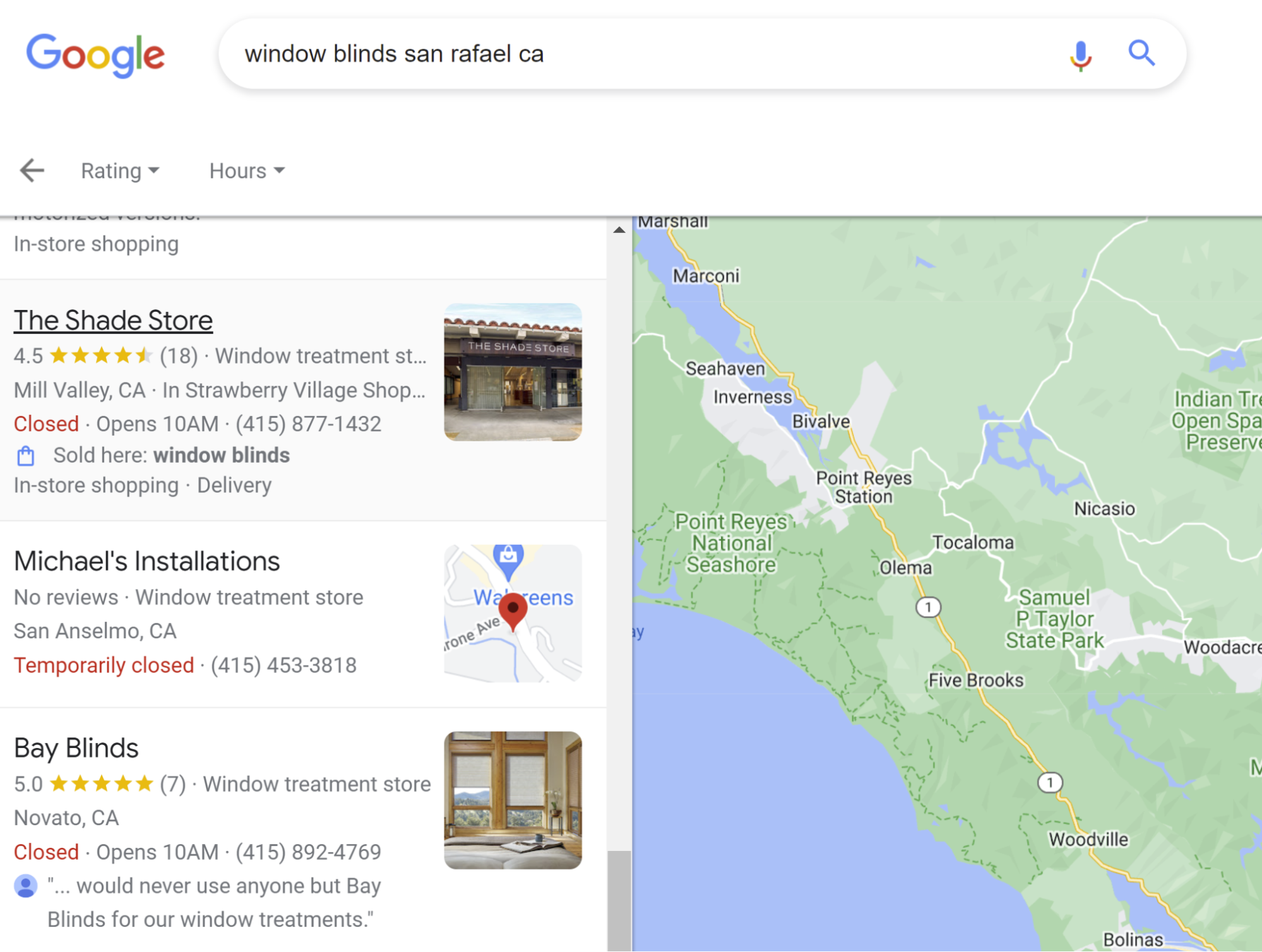 You already know whether the company you’re marketing is sharing a location with other businesses in the same industry. Look up your competitor’s address and zoom in on the map to see if any other businesses within the same industry are at that location. This matters because businesses in the same category at the same address may experience Google filtering them out of the results. This behavior has been especially noted since the 2016 Possum update. It’s important to understand that if the brand you’re marketing is in a shared space with another with the same category and you are not able to see your business on the local finder map unless you zoom in, Possum may be to blame.