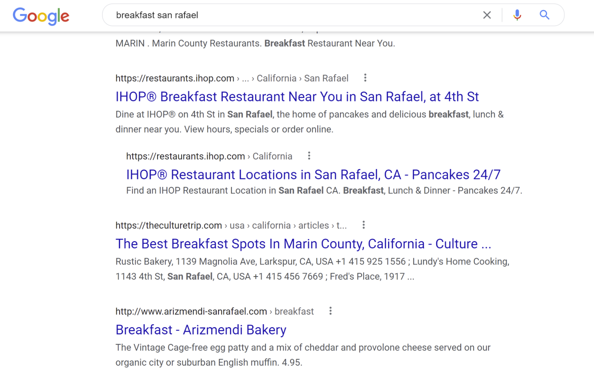 Look at the organic (not local) results for your search phrase. Subtract the listings that aren’t for actual businesses (in our above example, theculturetrip.com is lifestyle site rather than a restaurant) and record the true organic rank of your site and your competitor’s. Mark a win for whichever business has the highest organic rank.