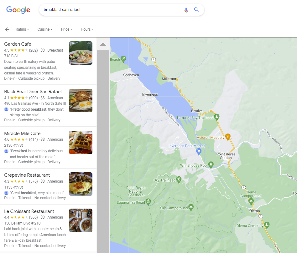 Now that you’ve filled out the name field of the business you’re marketing and its top competitor, evaluate how the actual words in the name could be impacting rankings. Google has historically given a ranking boost to businesses with names containing keywords. For example, if our search phrase was “Breakfast San Rafael”, then a business named “Delish Breakfast” or “Good Morning San Rafael” might have some advantage over one named “Joe’s Place”.