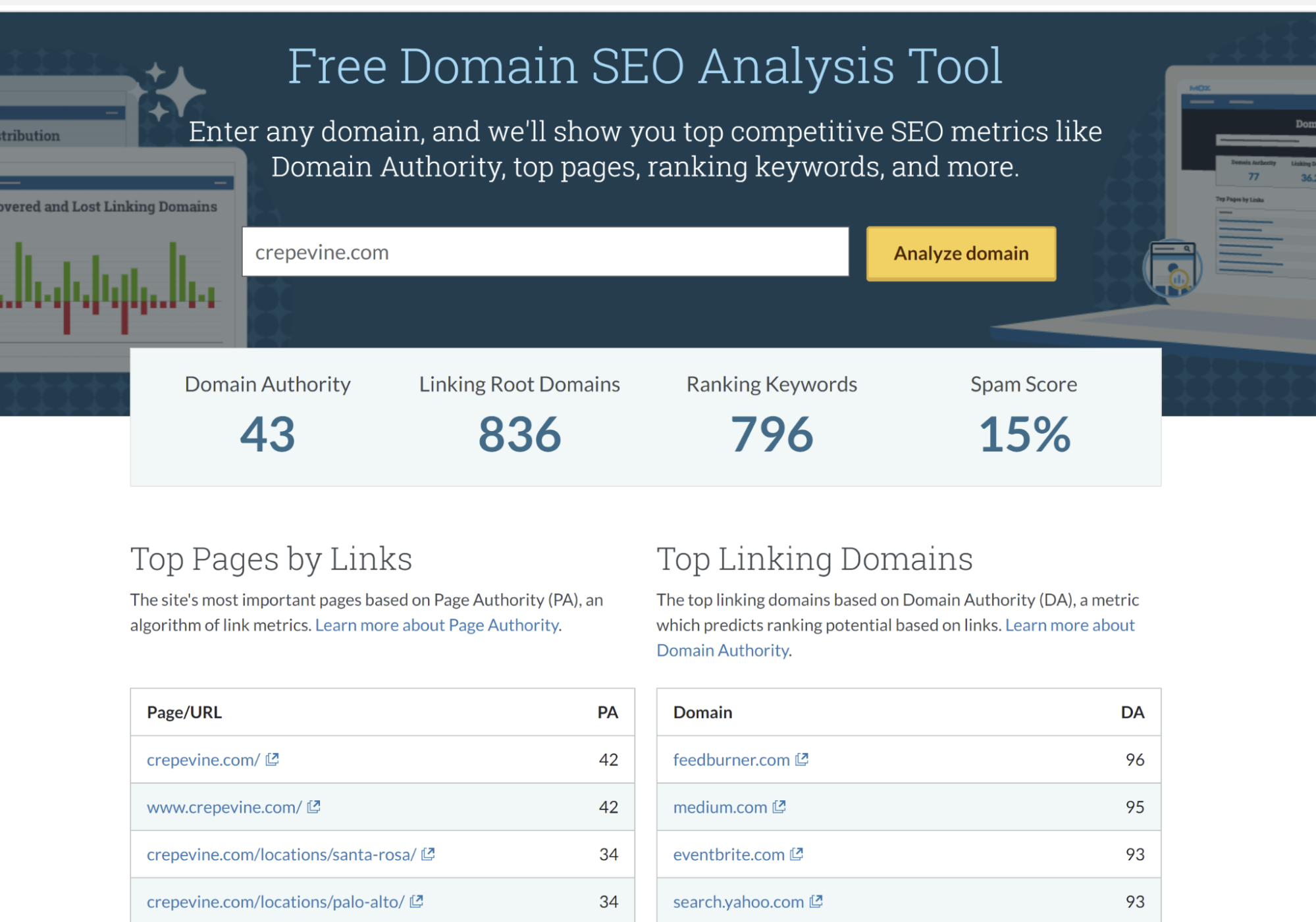 Domain Authority (DA) is a Moz metric for predicting how likely a website is to rank in the search engine results. Page Authority (PA) evaluates the same scenario, but for a single page on a website. Top Linking Domains are based on the DA of the websites doing the linking from one site to another and how those links may contribute to rankings.