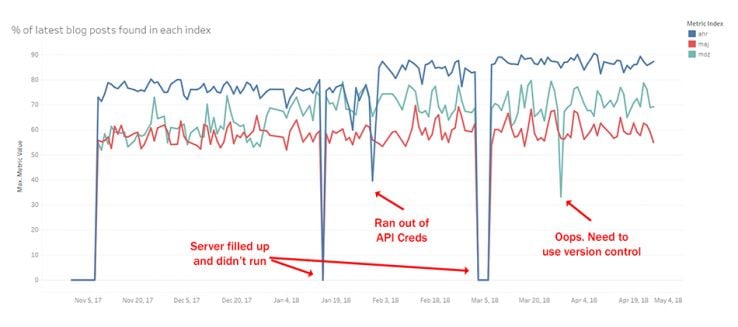 Once again, doing this at scale was not possible because one API is cost-prohibitive for top link sorts and another was extremely slow for large sites. We hope to run a set of live-link metrics independently from our daily metrics collection in the next few months.