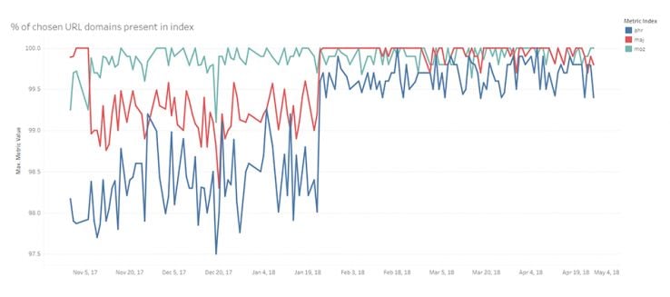 The scale of this graph is important to note as well. The variation is between 99.4 and 100% between Moz, Majestic, and Ahrefs over the last few months. This indicates just how close the link indexes are in terms of knowing about root domains. Majestic has historically tended to win this metric with near 100% coverage, but you would have to select 100 random domains to find one that Moz or Ahrefs doesn't have information on. However, Moz's continued growth has allowed us to catch up. While the indexes are super close, as of writing this post, Moz is winning.