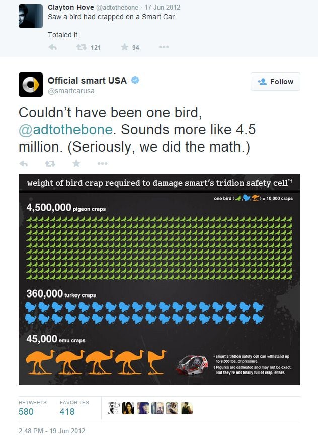 Here's how @smartcarusa responded when someone suggested that a single bird dropping would total one of their cars: