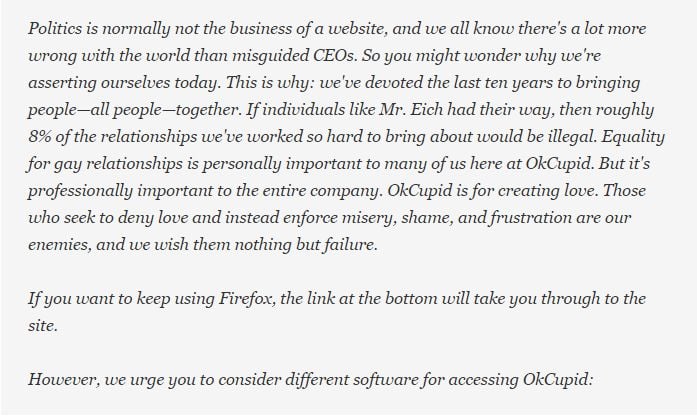 I think that taking the decision to stand for something is perhaps most potent when it could actually cost a brand customers. When Mozilla appointed a new CEO, OKCupid showed this message to Firefox users: