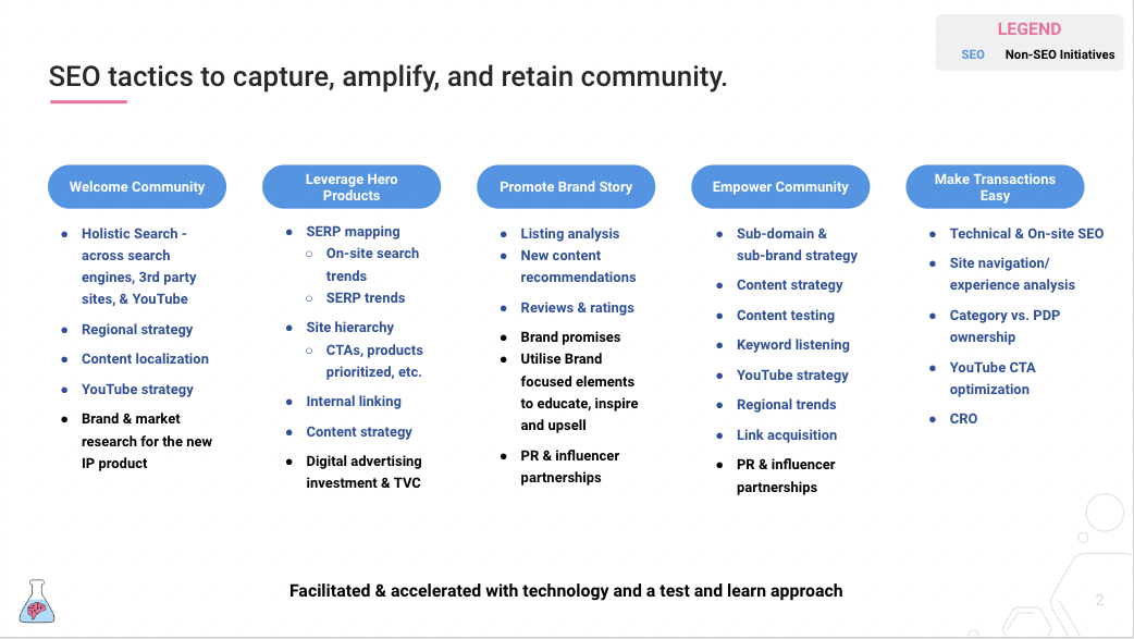 The community flywheel outline by McKinsey & Company succinctly explains how brands can build better communities, which in turn builds a better brand. It’s a five-step process underpinned by technology that enables scale and a test-and-learn approach that delivers consistent improvement. To align SEO initiatives for each of the 5 steps, I’ve created this graphic showing how initiatives apply to each step.