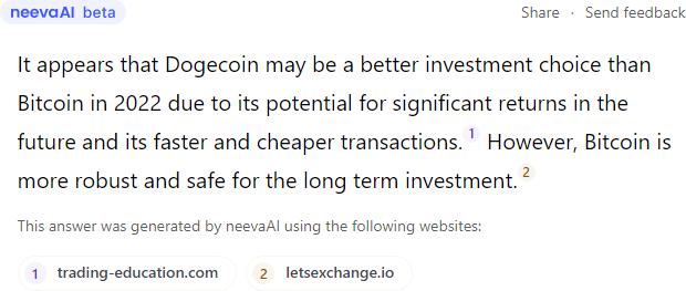 While this functionality is in beta and is obviously not operating at Google scale, Neeva attempts to provide primary sources. I’ve purposely chosen a ridiculous example because the stakes are low. Imagine a question squarely in what Google’s calls the YMYL (Your Money, Your Life) realm, such as “Is Bitcoin or Dogecoin better?”: