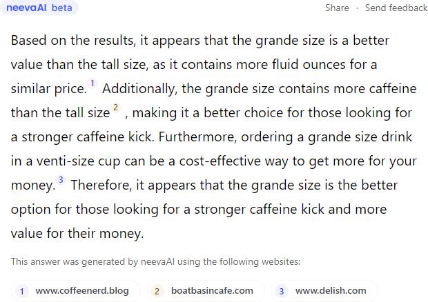 Consider this answer from Neeva — an alternative search engine focused on privacy (hat tip to Greg Sterling) — for “Should I get a tall latte or a grande?”: