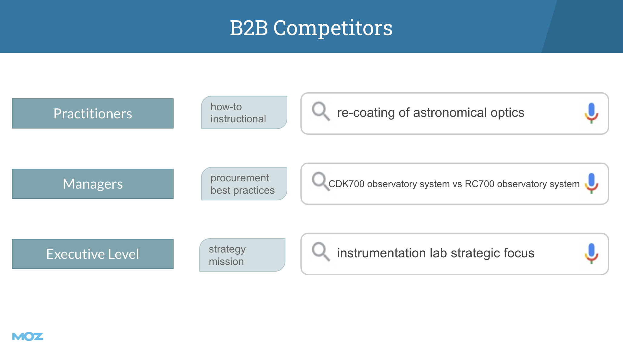 In this section, you’ll learn more about what approaches to consider if you work for either a B2B business or a local business. When it comes to B2B, your instructor will discuss a variety of methods for competitive research that work particularly well. Conducting competitive analysis for B2B can look a bit different when it comes to keywords, content, links, and social media.