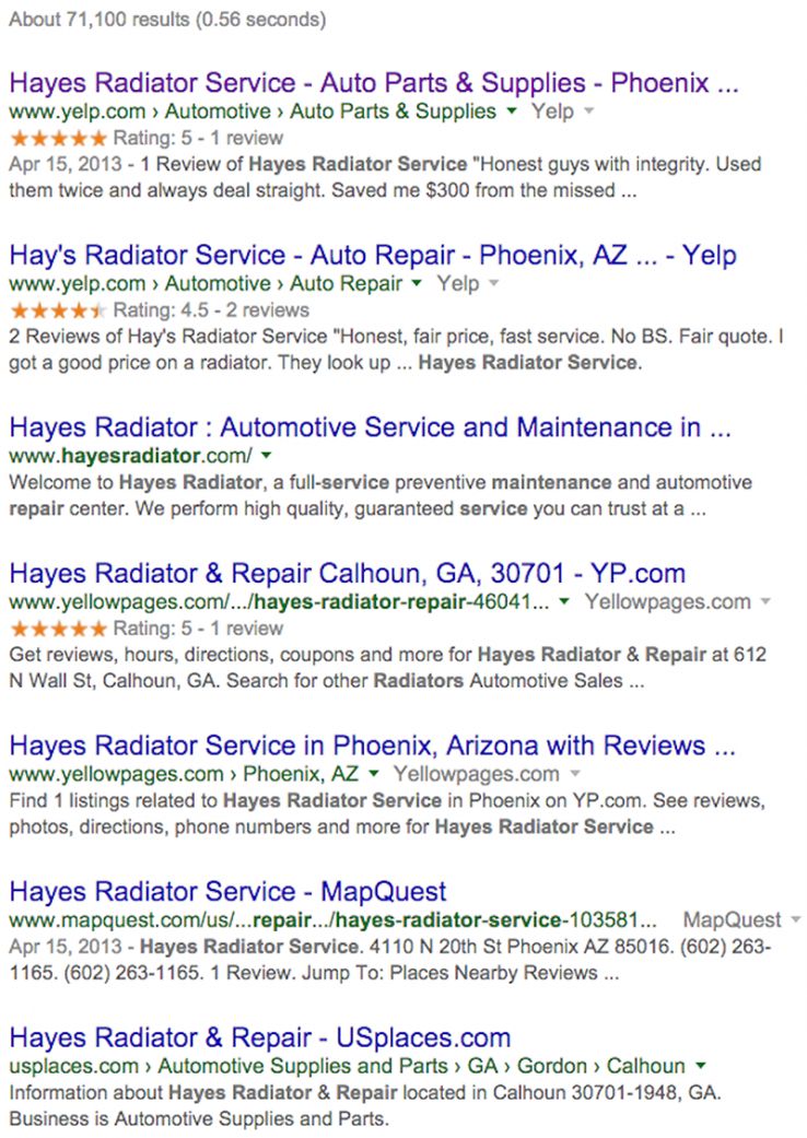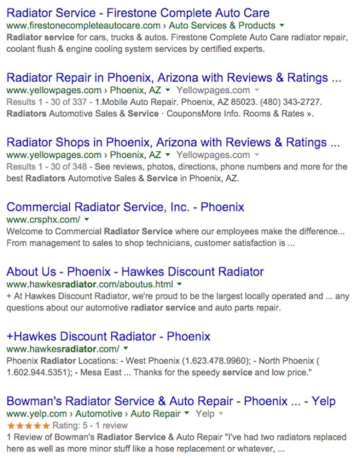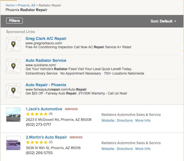 What keywords and phrases does your business target in search? Do a quick search for them to see which local directories rank in the top ten search results. Most keyword searches related to local businesses will lead you to your website, your competitors' websites, specific business listings in local business directories, and categories on local business directories.