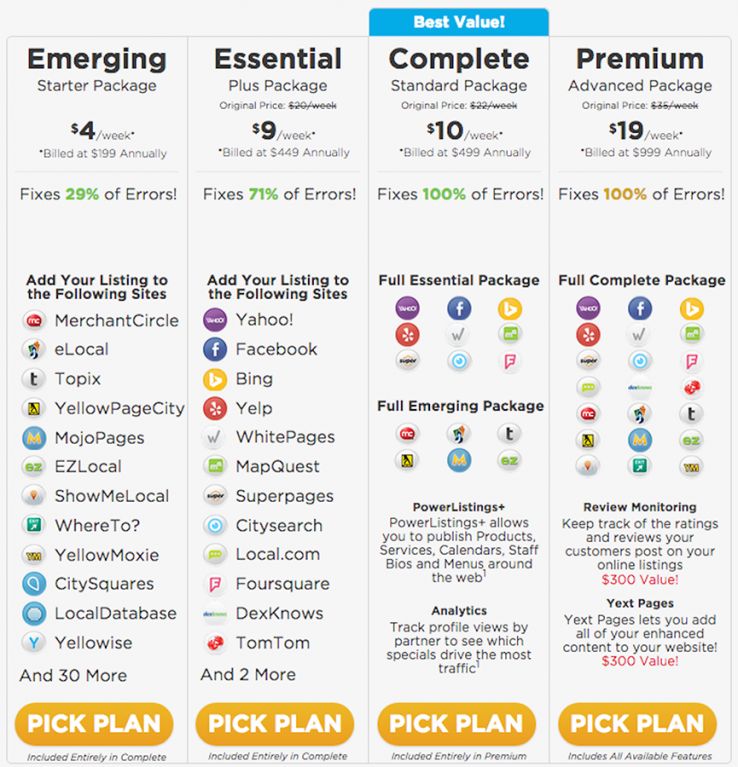 With the above service, you're looking at a minimum of $199 per year for one network, or $999 per year for dozens of networks. While it might look like a good deal, in reality, you are paying for listings that you could have gotten for free (Yahoo, Facebook, Google+, etc.) in addition to ones that have a paid entry.