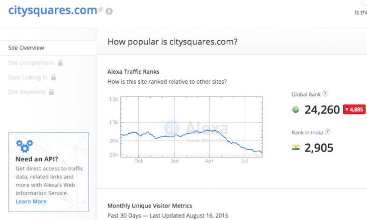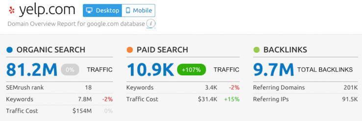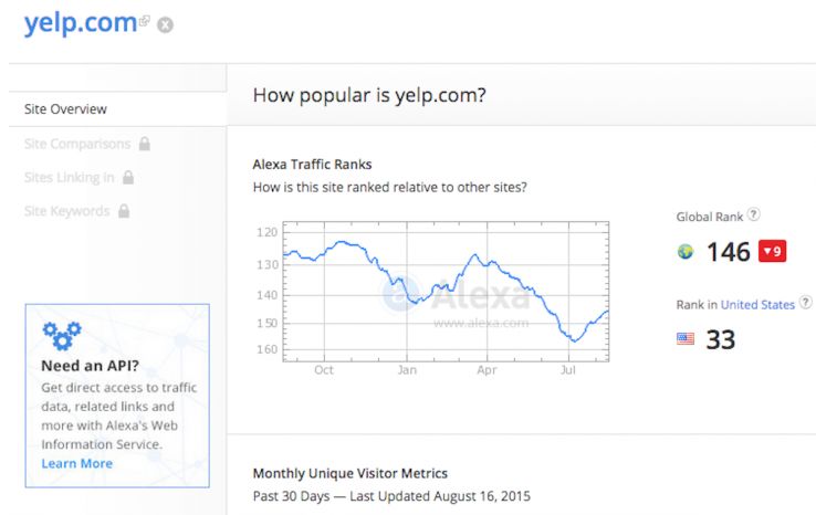 Alternatively, you can use sites like Alexa to estimate traffic through seeing which site has a lower Alexa ranking. For example, you can check Yelp's Alexa ranking: