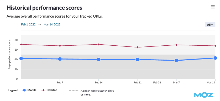 It might be worth noting that if you want more data, Moz Pro Performance Metrics section of Site Crawl displays historical data for up to 90 days for tracked URLs.