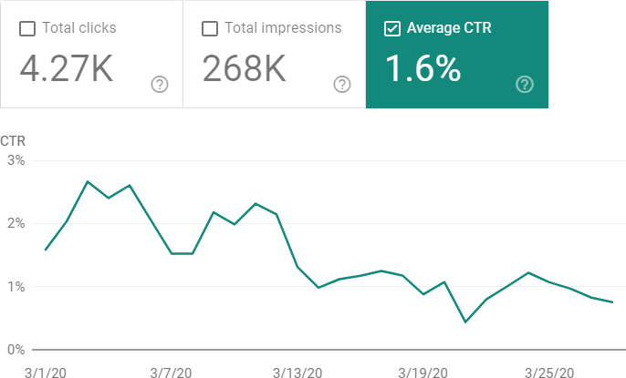 CTR has also dropped, even a bit steeper than impressions. This is a bit harder to interpret. Knowing what we know, it's likely that people are clicking less because of overall lack of interest. This is consistent with the COVID-19 scenario. People are less likely to be looking for the service this site offers. On the other hand, it could be that something about the site or the competitive landscape has changed that's driving down CTR.
