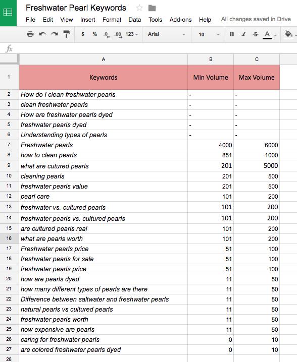 I’m also interested in the words around "price" and "value," so I’m doing the same and saving those to my sheet, along with the search volume. A few attempts at researching the "cleaning" of pearls wasn’t very fruitful, so I’ve adjusted my search to "clean freshwater pearls."