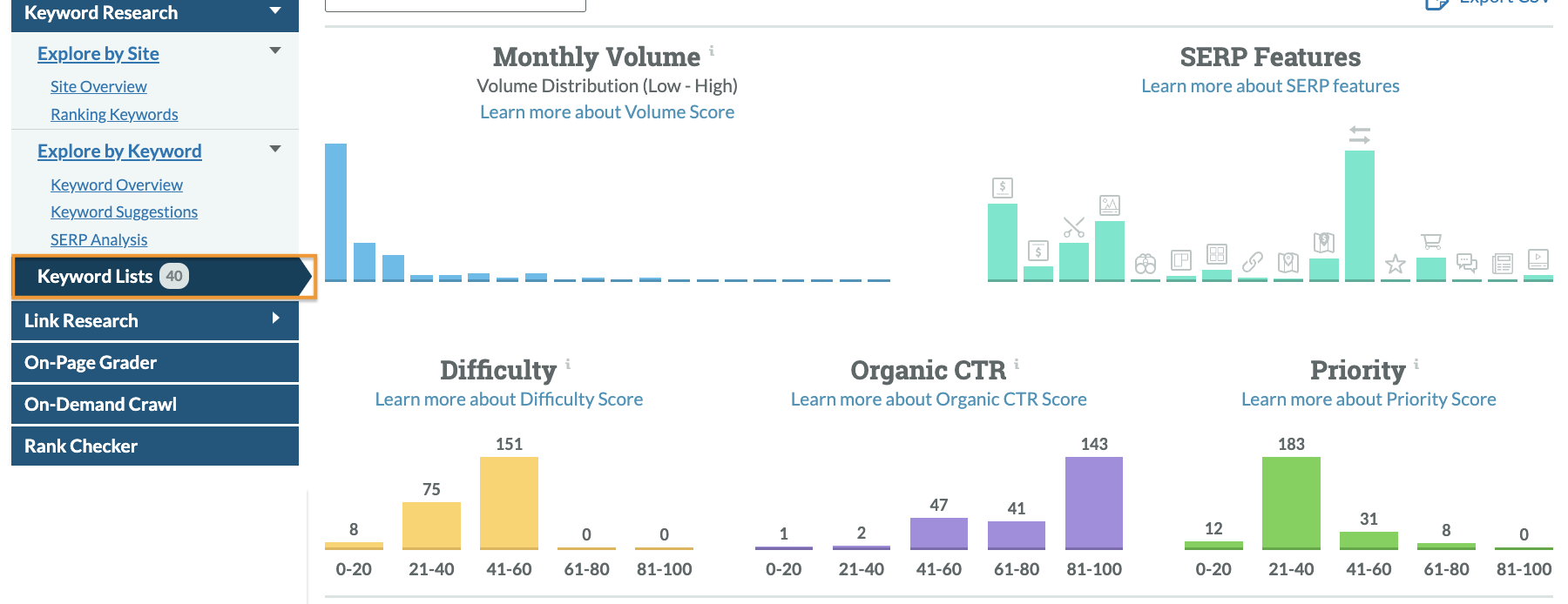 You can compare Volume, SERPS Features, Difficulty, Organic CTR, and Priority across multiple lists, topics, and niches.