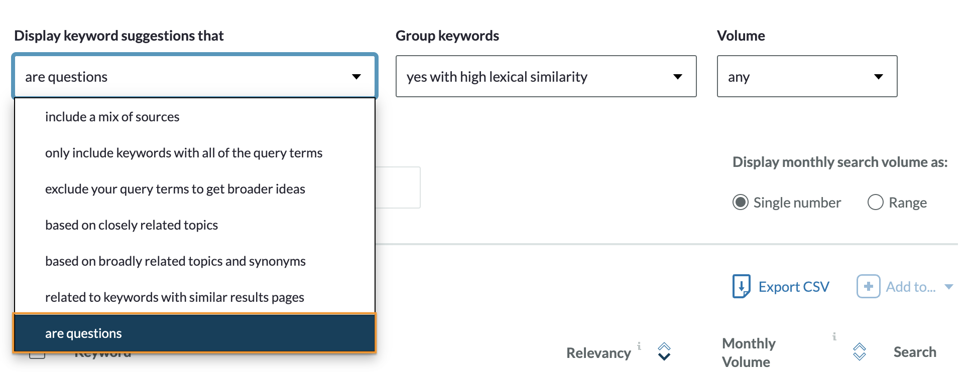 Because I’m a keyword questions fanatic, I’m also going to filter by questions (the bottom option from the drop-down menu):