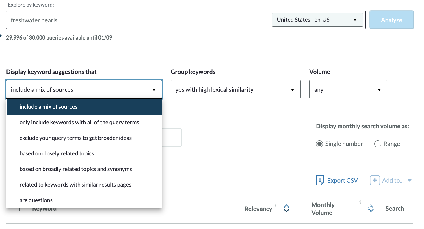 Now this is starting to look interesting: we’ve got some keyword modifiers, some clear buying signals, and a better idea of what people might be looking for around "freshwater pearls."