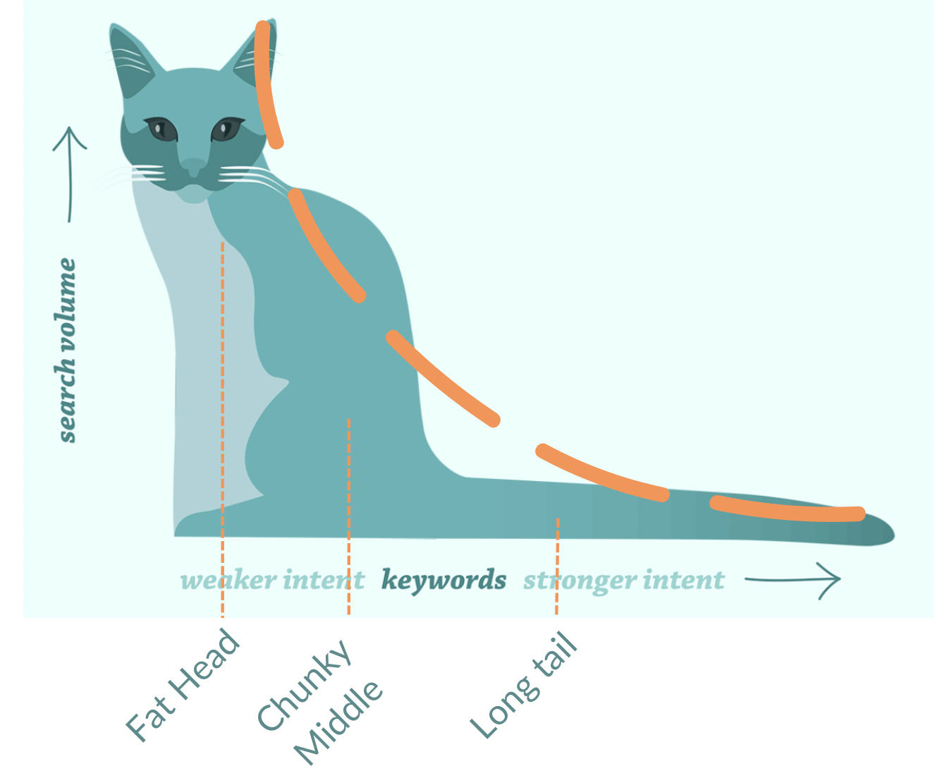 The Search Demand Curve illustrates that while “head” and “body” terms typically amass higher search volume, seeming appealing at first. The vastness of the “long tail” presents a more substantial opportunity and larger percentage of search traffic that shouldn’t be ignored. You can really see this illustrated when combined as a percentage of search traffic. While this graph contains no cats, it is still entirely illustrative. However the long tail of search isn’t slowing down anytime soon with voice search and AI integrations we can expect the vastness of the long tail to continue to grow.