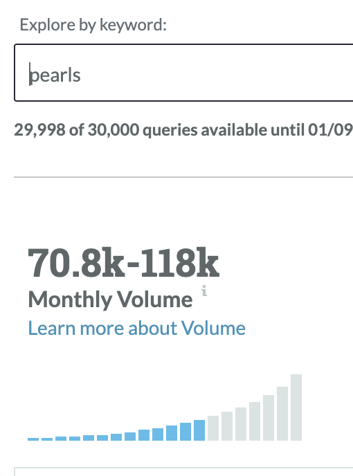 To start, enter a broad industry keyword. In my case I’ll type in "pearls" into the Keyword Explorer search box. Now you can see Moz’s Monthly Volume displaying how often a term or phrase is searched for in Google: