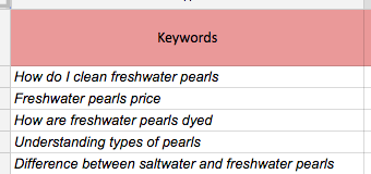 Time to draw on that valuable industry knowledge you’ve been storing up, jot down some ideas, and think about intent and common misconceptions. I’m going to use the example pearls or freshwater pearls in this post as the head term because that’s something I’m interested in.