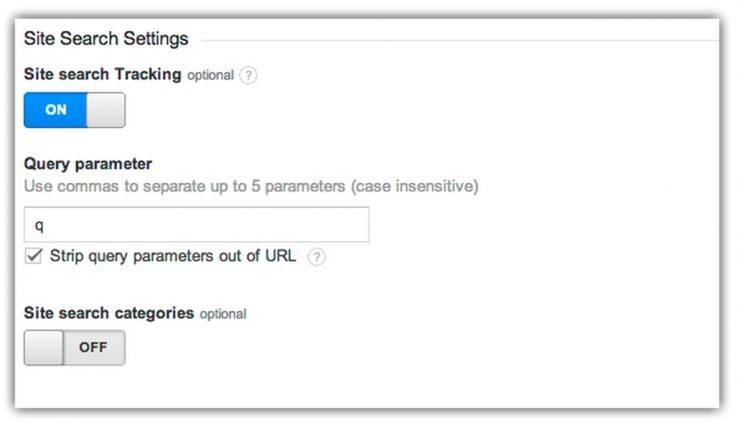 Step 2: Navigate to Admin > Settings and scroll to the bottom for "Site Search Settings." Enter in the parameter that is designated for a search query on your site; for example /search_results.php?q=keyword. If you use a POST-based method and do not pass through a parameter in the URL you can either configure your application to append one, or you can trigger a virtual pageview in your Google Analytics snippet, such as:
