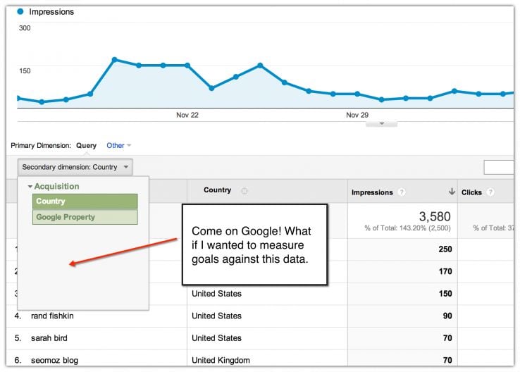 Finally, there is a limitation in how you can use Webmaster Tools data in Google Analytics. The good news is that you can integrate this data into Google Analytics with some basic authentication between the services. The bad news is that you can only segment the data in Google Analytics with 2 dimensions: country and Google property. Joining this data with behavior, demographics, goals, etc. would be extremely valuable.