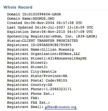 If you looked up SEOmoz.org on Whois.domaintools.com, here is what you would see after scrolling just below the fold of the page: