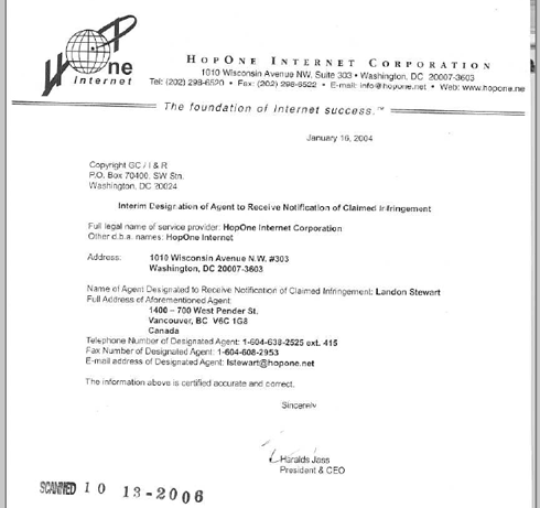 However, it won't always be so easy. Let's assume for a minute that you couldn't find contact information for HopOne on its site. The DMCA has statutory incentives to encourage OSPs to register with the U.S. Copyright office. Thus, to locate the contact information for your OSP, go to the U.S. Copyright office list of designated agents for OSPs. Look on that list under the letter "H" for Hop One.