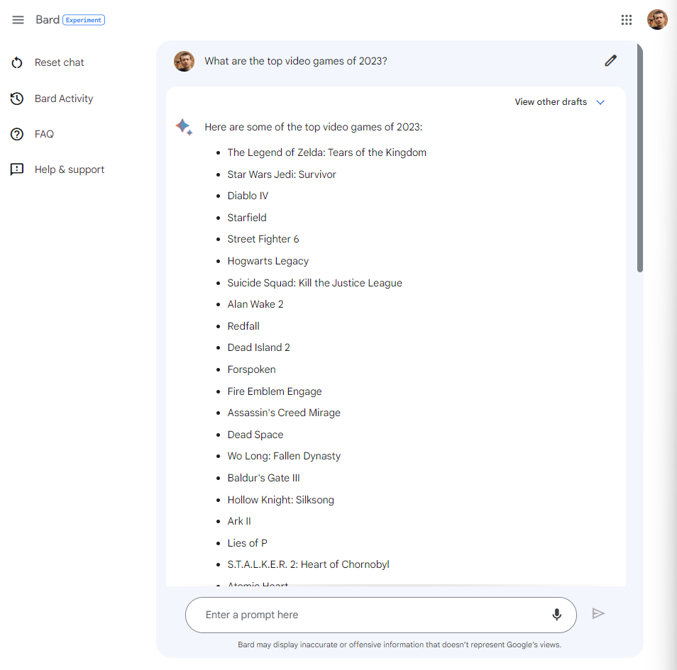 That said, I like that the framing of Google’s solution — with multiple draft answers presented and “enter a prompt here” — which makes it clearer I’m dealing with something that is not a source of unassailable truth.