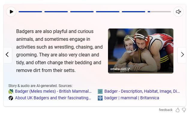 You can see here that a picture of wrestling has been sourced to accompany the text about badgers wrestling. These AI-generated boxes don’t appear for most queries — only clear and uncontroversial informational intents.