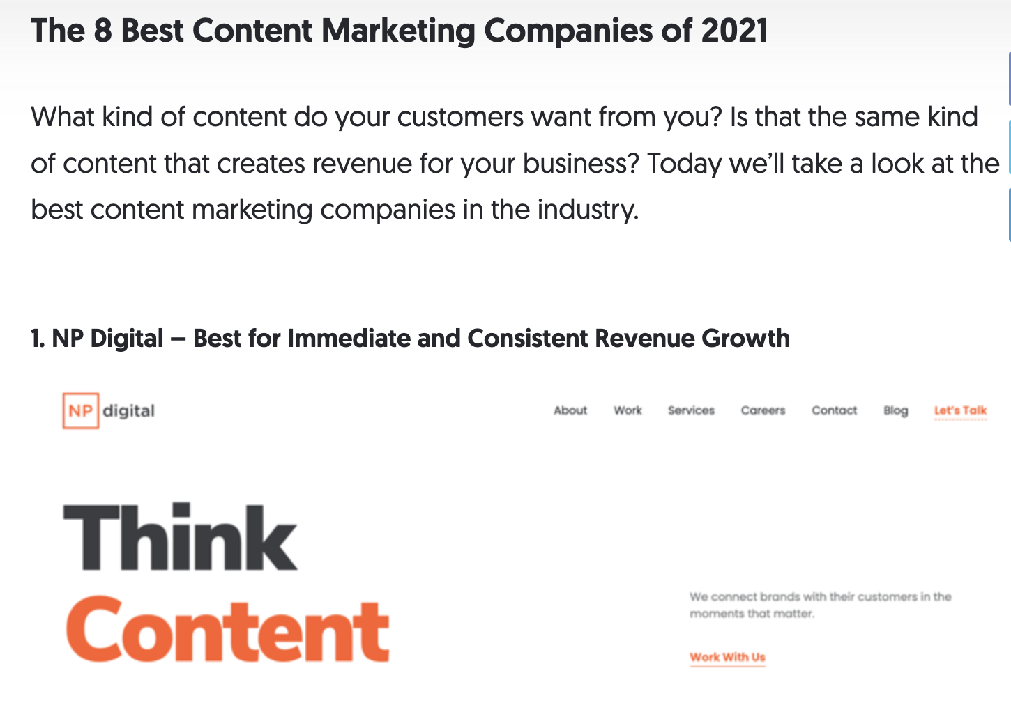 These could be off-site content from a third party writing about other companies, or an on-site list in which the publisher shrewdly ranks multiple companies, including their own. Here is NP Digital doing that very thing: