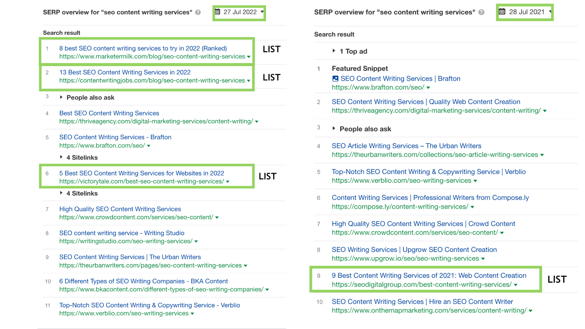 Here’s an example for the keyword “SEO content writing services.” The image on the left is the SERP in 2022, and the one on the right is the SERP in 2021:
