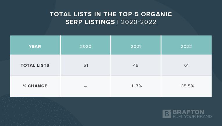 The number of lists in the top five positions increased by 35.5% from 2021 to 2022. In this case, our sample size is a hard 125 listings, since we counted the first five organic results for every single one of our 25 keywords.