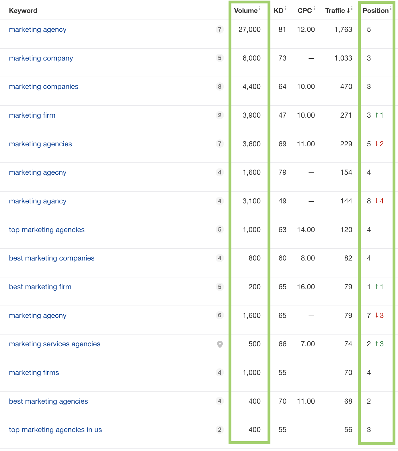 When should you stop investing in certain commercial landing pages? Like I said, commercial pages are going extinct on the SERP for one of our most important keywords, “content marketing agency.” For now, we’re in position three. But we’ve seen all but one of our competitors get knocked onto page two. What happens then?