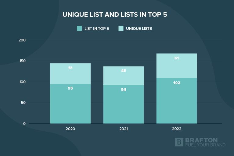 2022 had double-digit percentage gains in terms of lists in the top-five results over both 2021 and 2022.