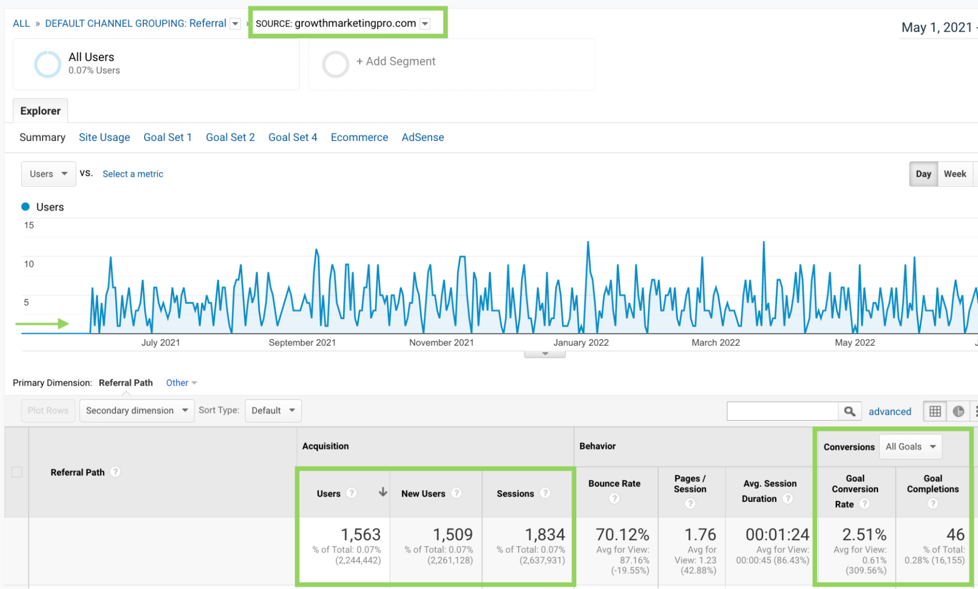 In mid-2021, our link building specialist spent literally five minutes getting us listed in a directory called Growth Marketing Pro. As a result of those five minutes, we’ve since earned over 1,500 users, and 46 conversions.