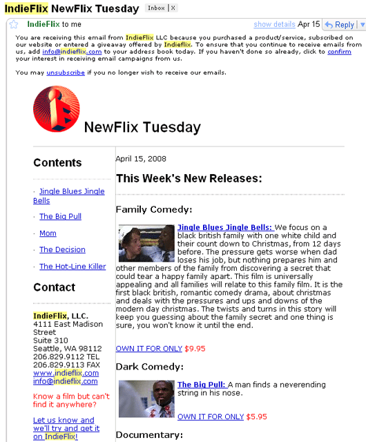 IndieFlix's newsletter is a lot like the Landmark Theatres newsletter I shared earlier on in this post. The reason I like this newsletter better is that it offers the same compelling, interesting information (new releases, movie synopses) but in a much more concise manner. Two thumbs up!