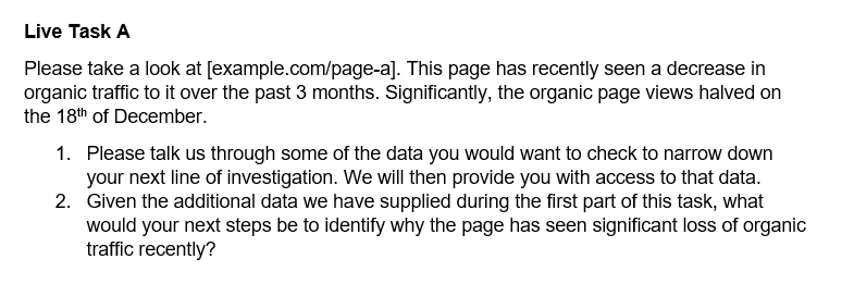 An interview assessment method that is common in the engineering and development world, but hasn’t really made it across to SEO, is the live task. Candidates can be given a problem to solve, or a website to audit, and asked to work on it whilst they are in the interview. This way, they can easily be provided with the tools they need, the risk of them asking for external help is mitigated, and they aren’t required to spend additional time outside of the interview to prepare for it.
