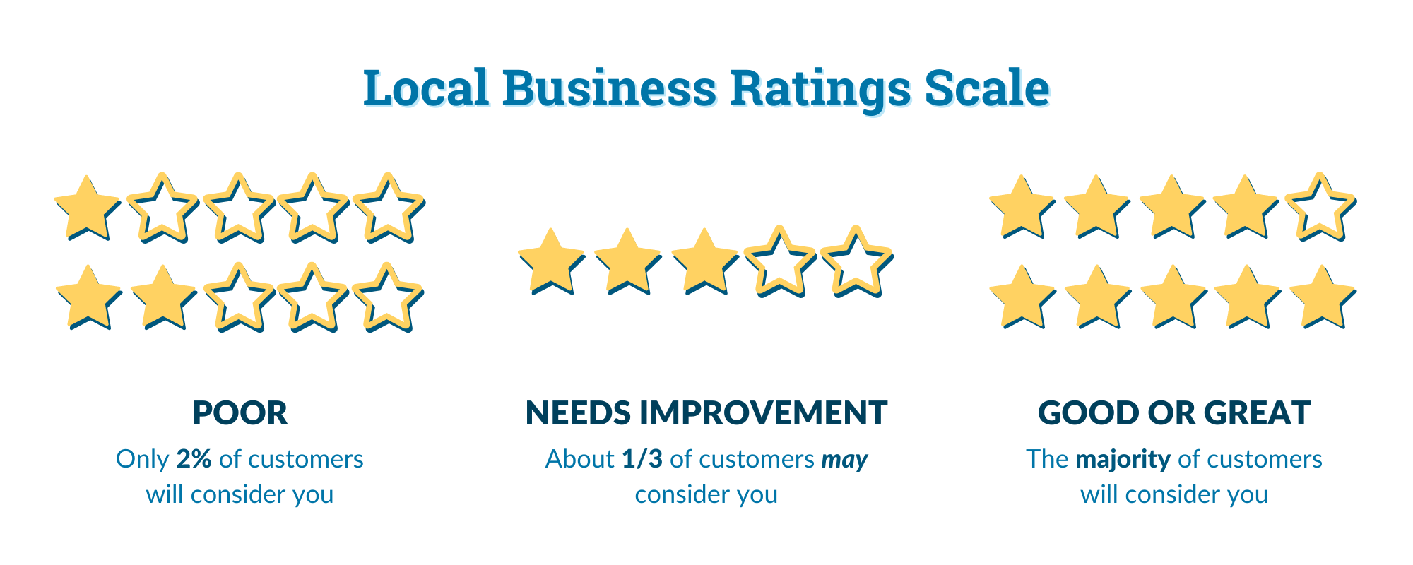 Yet, hope can be found in the fact that about ⅓ of consumers may still give you a try if your organization’s overall reputation is only 3 stars. This could give you the grace period you need to keep the lights on while you strategically improve your operations to start winning more trust and business in your community. We’ll grade a 3-star reputation as “needs improvement”. The work involved will be harder if the reputation has dropped to 2-or-less stars, as only 2% of the public is likely to consider patronizing you. This rating would be considered poor, but you can improve it with a serious commitment.