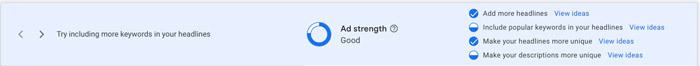 When creating responsive search ads, utilize the ad strength indicator to gauge your progress, and aim for ad strength of “Good” or “ Excellent”. Ad strength measures the relevance, quality, and diversity of your ads.