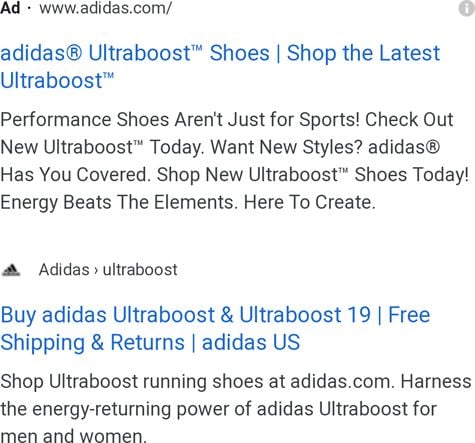 While Google isn't using the exact icon we'd prefer at Moz, the square, color-filled logo representation is clearly pretty different from Google's black "Ad" marker. Some brands aren't so lucky. Consider these two results for Adidas.com ...