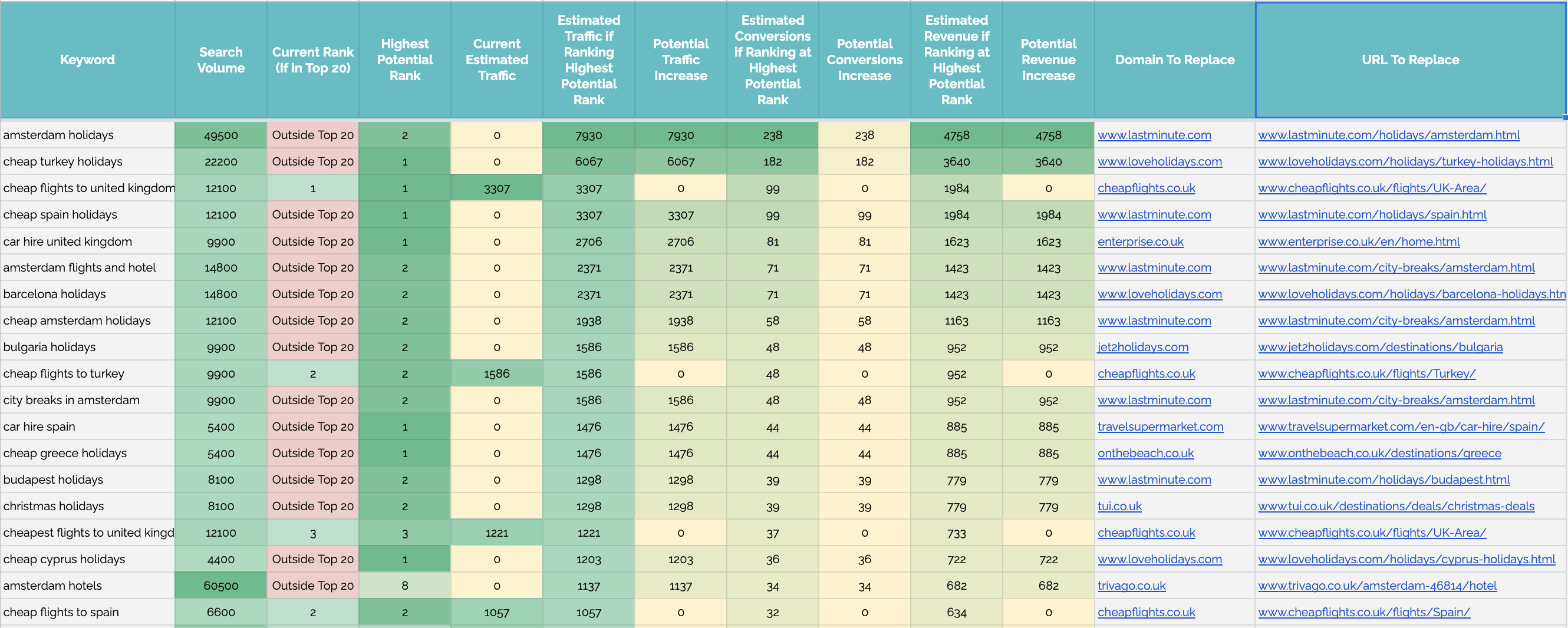 Then, in the [Output 3] Keyword Opportunities tab you'll get a list of the best potential rankings you could get for each keyword, ordered by total additional traffic and revenue you could get from on top of what you are currently getting.