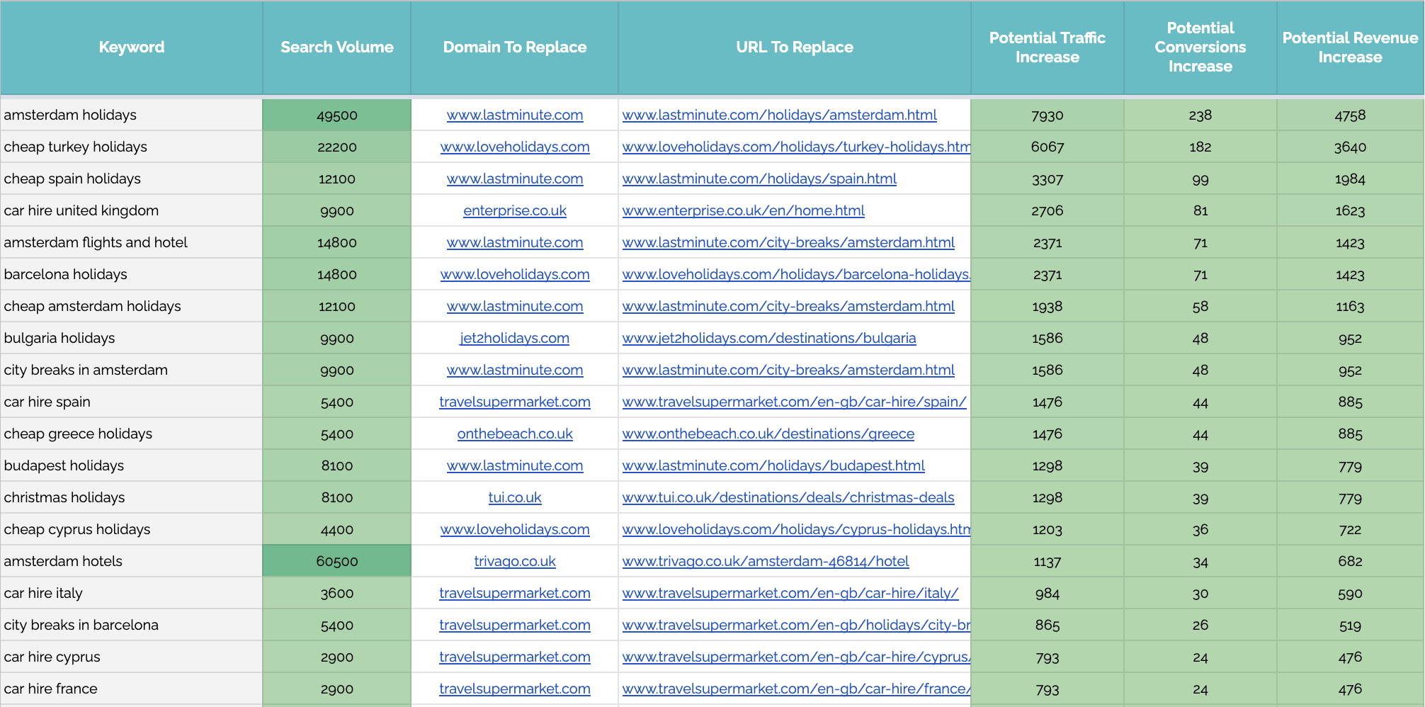 This output provides the top-level summary focusing on the keyword, search volume, and which domain/URL you could seek to replace. The metrics in this output are focused on potential additional traffic, conversions, and revenue.