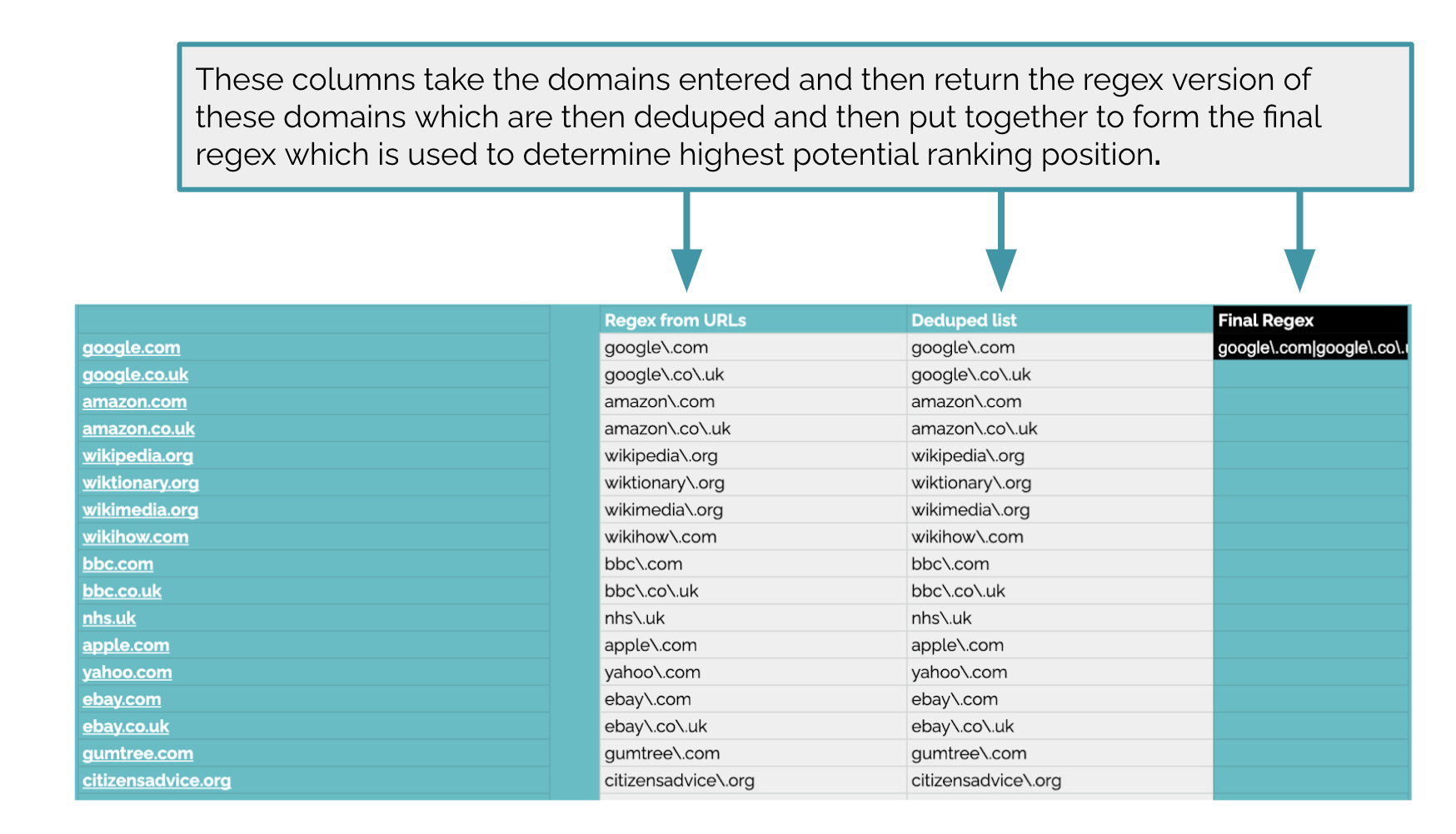 The domain selection uses REGEX in order to combine together a list of different domains which are used in the different outputs to determine whether a site can rank for a specific domain or not.