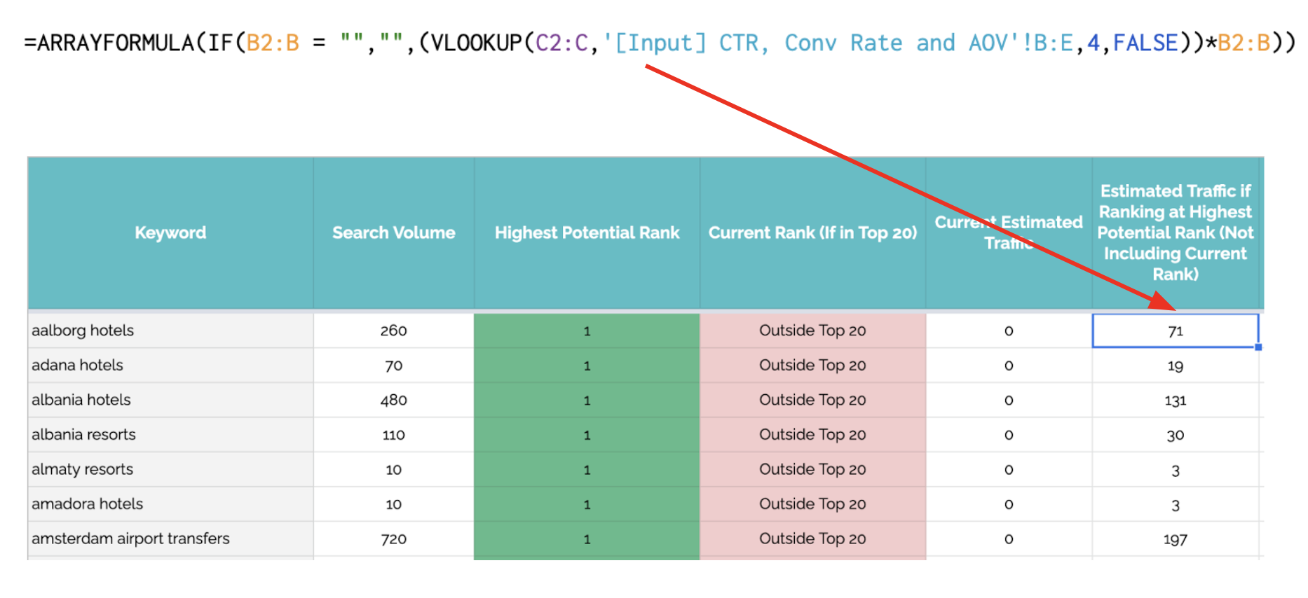 The estimated traffic, conversions, and revenue positions take the inputs from the [Input] CTR, Conv Rate and AOV tab.In the example below, we are working out the estimated traffic by multiplying the highest potential rank (in column C), looking up the CTR for that position and then multiplying it by the Search Volume (in column B). The same logic applies to the conversions and revenue figures.