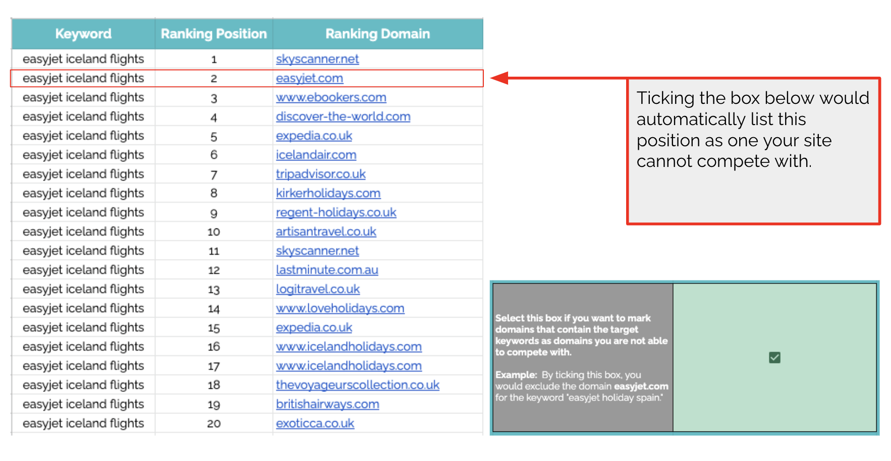 When doing keyword analysis, you may also realize there are some terms in your list like “Easyjet iceland flights”. If you don’t think you could beat Easyjet for “Easyjet iceland flights”, you can tick a box and the sheet automatically ignores any time Easyjet is ranking for a search that includes the word “Easyjet”.