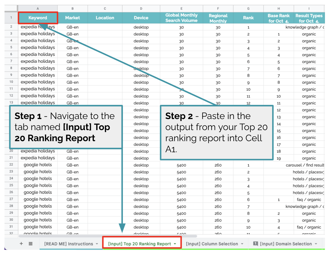 Import your top 20 report into the tab named [Input] Top 20 Ranking Report, pasting into cell A1. You should delete/override the existing dummy data. The top 20 ranking report can come from any rank tracking tool, for example STAT, Rank Ranger, Accuranker, Data For SEO, etc.