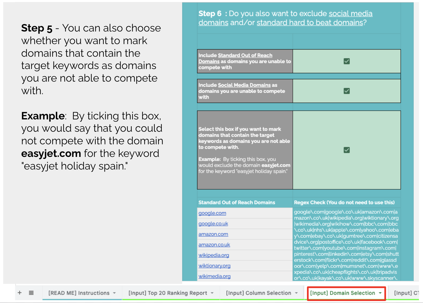 Finally, you can decide whether you want to exclude domains that contain target keywords in the domain name. For example, if you don’t think you could beat Easyjet for “Easyjet flights”, tick this box and the sheet automatically ignores any time Easyjet is ranking for a search that includes the word “Easyjet”.